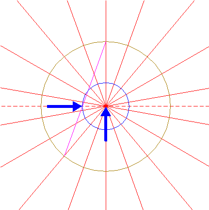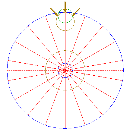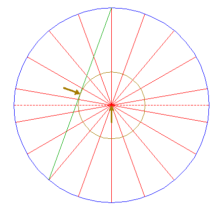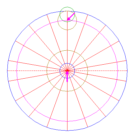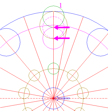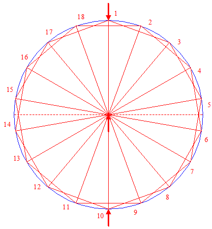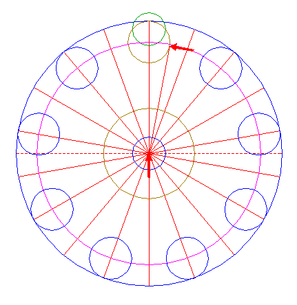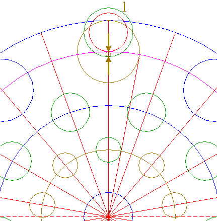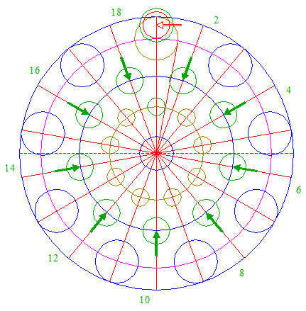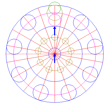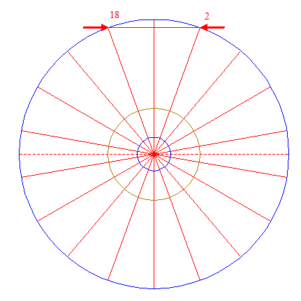 | Construct two inscribed nonagons (regular 9-sided polygons) of circle 1, one pointing up, one pointing down. Draw the eighteen rays, from the center of circle 1, to the angular points of both nonagons. Number the rays, clockwise, 1 - 18, starting at the top.
