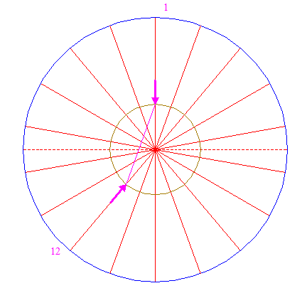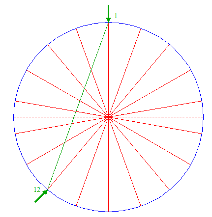 | Draw the connecting line between the intersections of rays 2 nrs. 1 and 12 with circle 1.