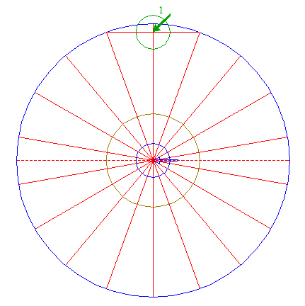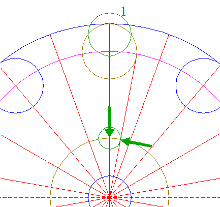 | Construct the "two-points" circle (defined by the two end-points of a centerline) between the intersections of circles 8 and 17 with ray 2 nr. 1.