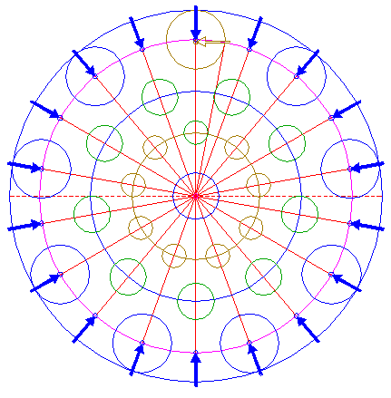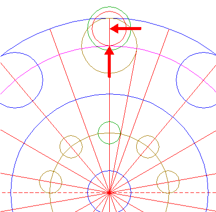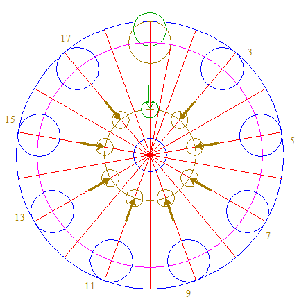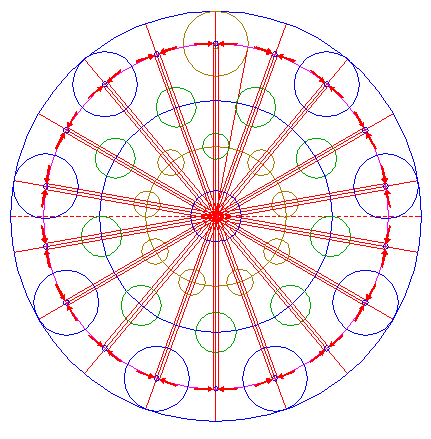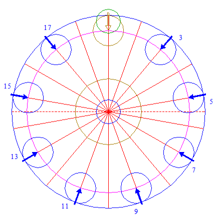 | Copy circle 17 nine times, to the intersections of circle 16 and all even-numbered rays 2.