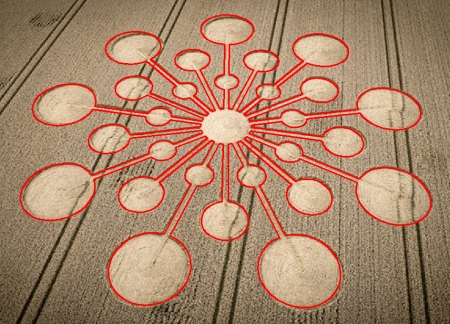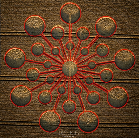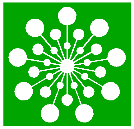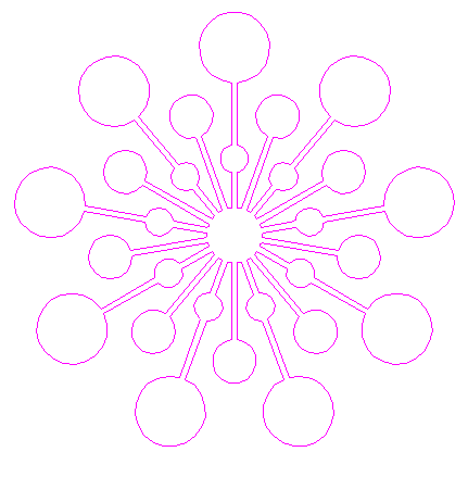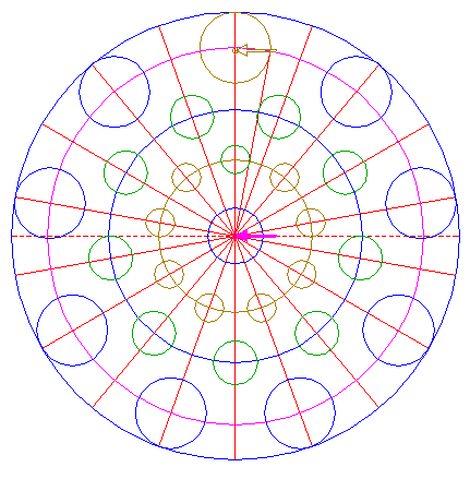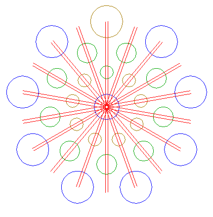 | Copy circle 19 eighteen times, to the intersections of circle 10 and all rays 2.