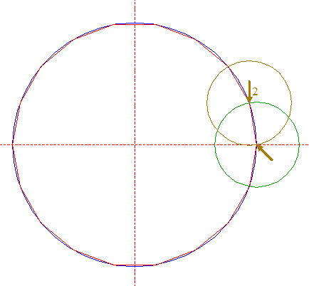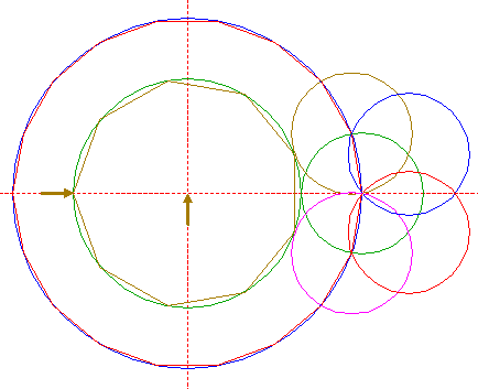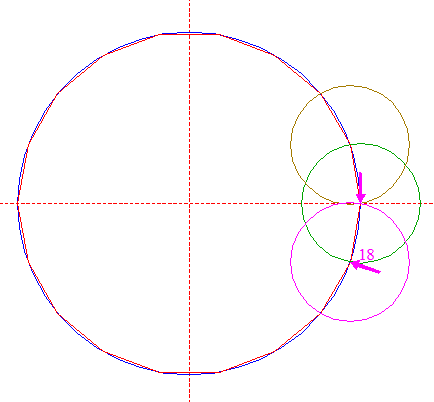 | Construct the inscribed regular 18-sided polygon of circle 1, pointing to the right. Number the angular points 1 - 18, counterclockwise, starting at the rightmost one.