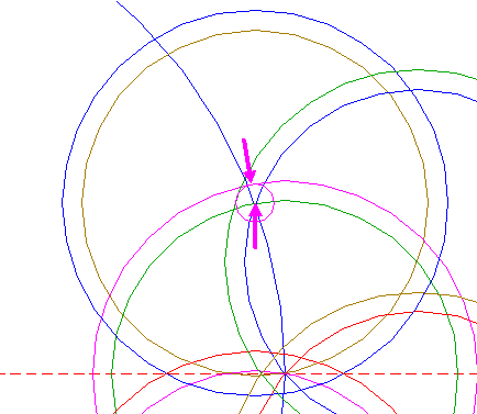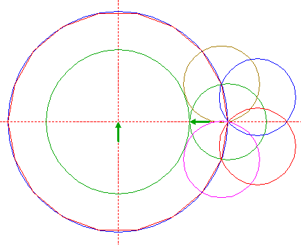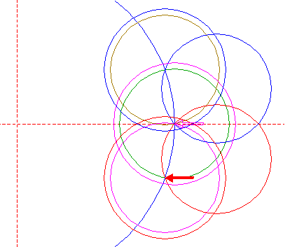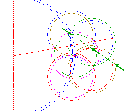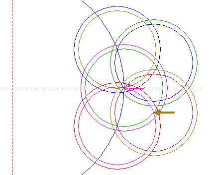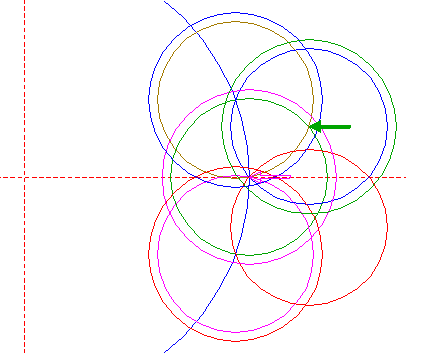 | Construct a circle centered at the righthand intersection of circles 3 and 5, passing through the center of circle 3.