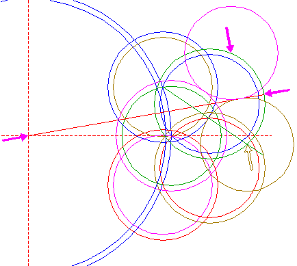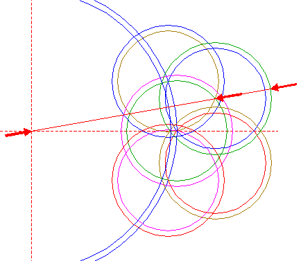 | Draw a line between the center of circle 1 and the righthand intersection of circles 3 and 4, and extend this line upto the righthand side of circle 13.