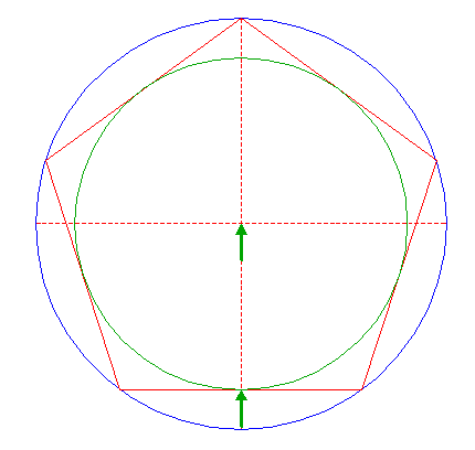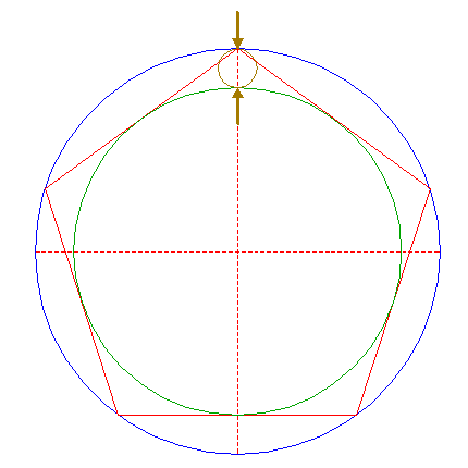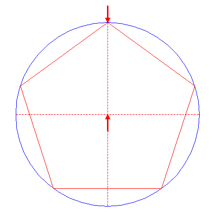 | Construct the inscribed pentagon (regular 5-sided polygon) of circle 1, pointing up.