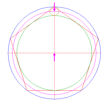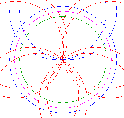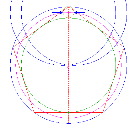 | Construct the "two-points" circle (defined by the two end-points of a centerline) between the upper intersections of circles 1 and 3 with the vertical centerline.