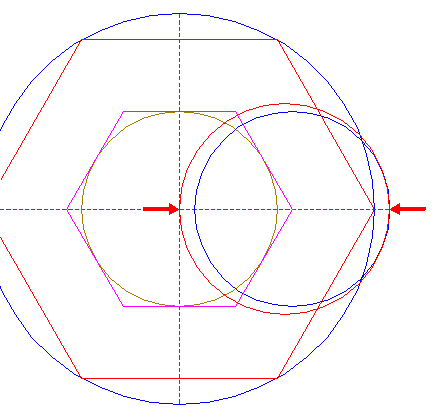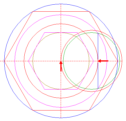 | Construct the "two-points" circle (defined by the two end-points of a centerline) between the center of circle 1 and the righthand intersection of circle 6 and the horizontal centerline.