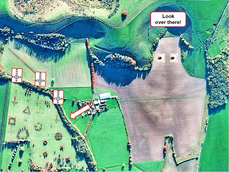 arrow) points to another field, which he can “see” nearby: