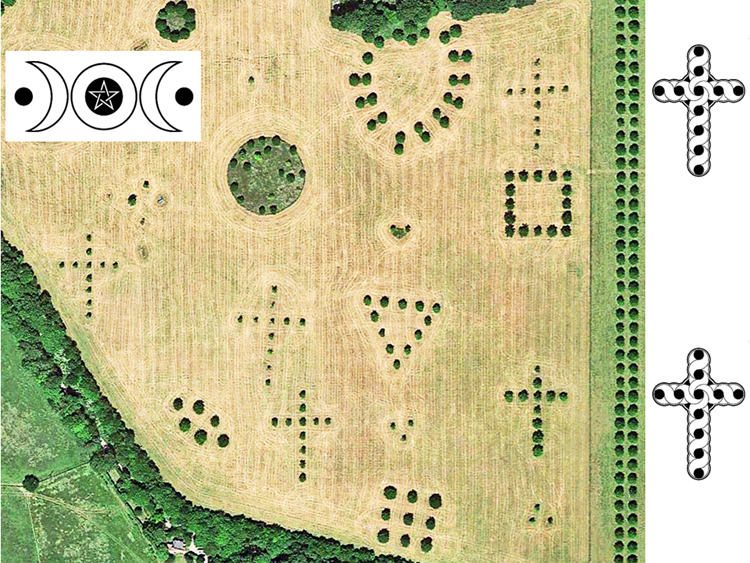 In that nearby field, we can see five "Christian crosses", and a "heart"