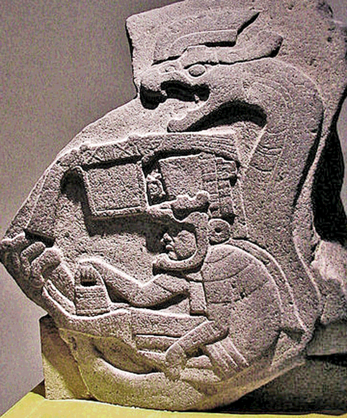 Quetzalcoatl riding a “flying serpent” (rocket-jet plane) in