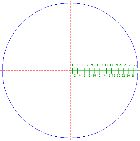 | Divide ray 2 into 28 equal parts. Number the nodes 1 - 27 from the center outwards.