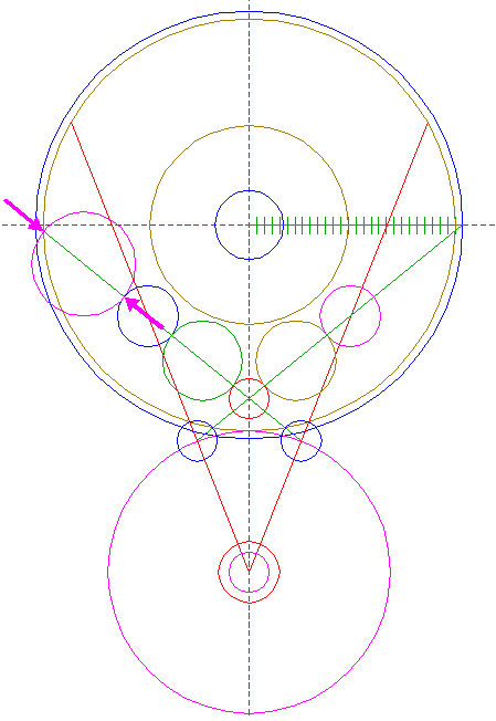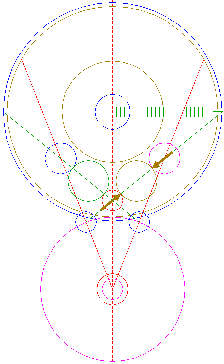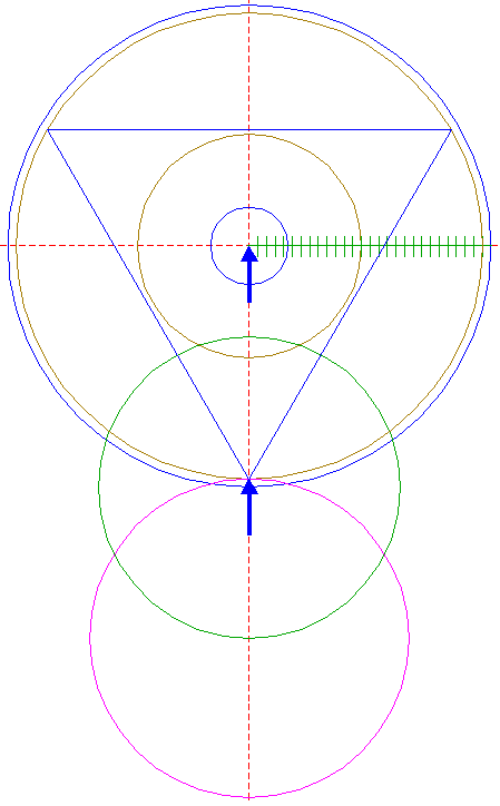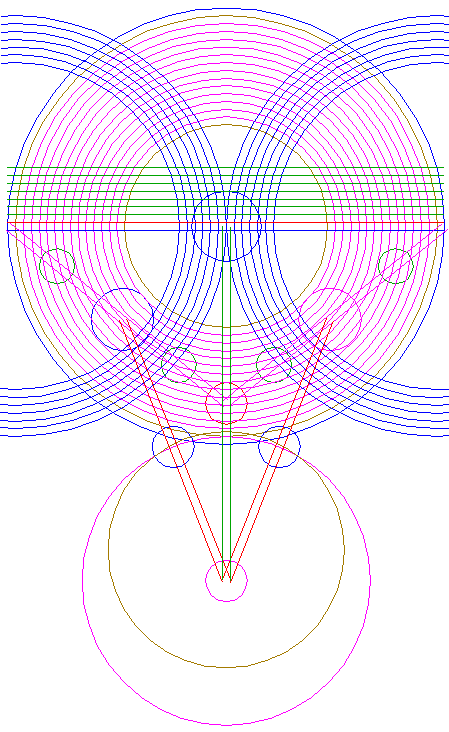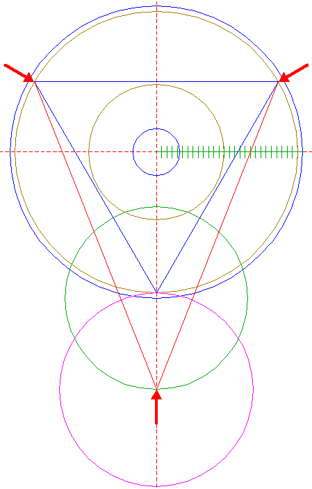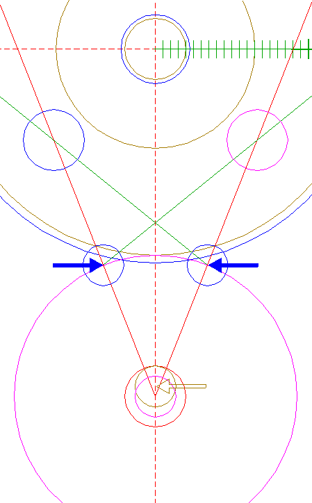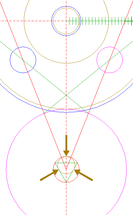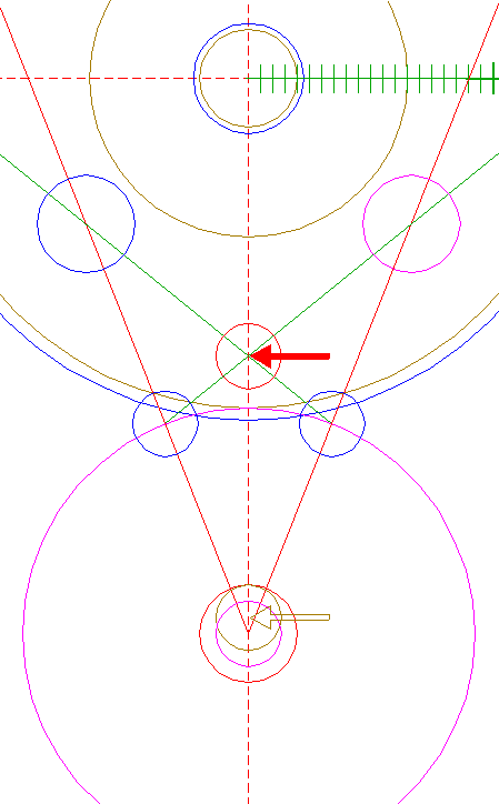 | Construct a circle centered at the upper intersection of circle 17 and the vertical centerline, passing through the righthand intersection of circle 10 and righthand circle 21.
