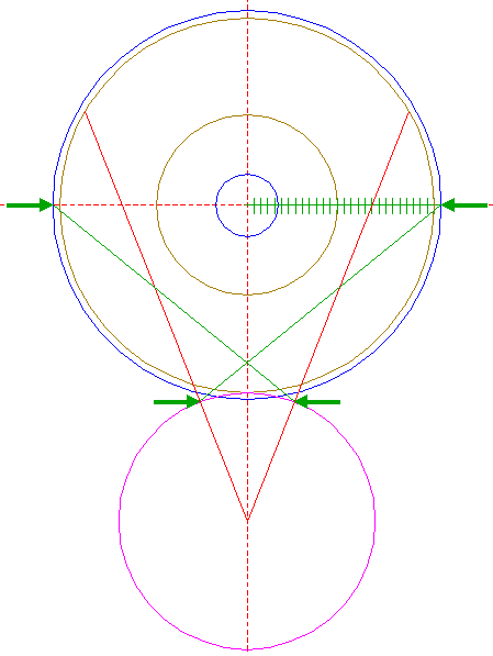 | Construct a circle centered at the upper intersection of circle 33 and the vertical centerline, tangent to circle 33 at the lower side.