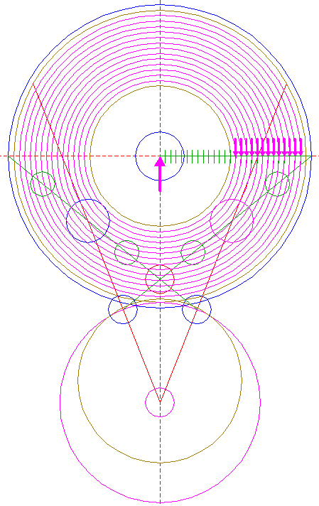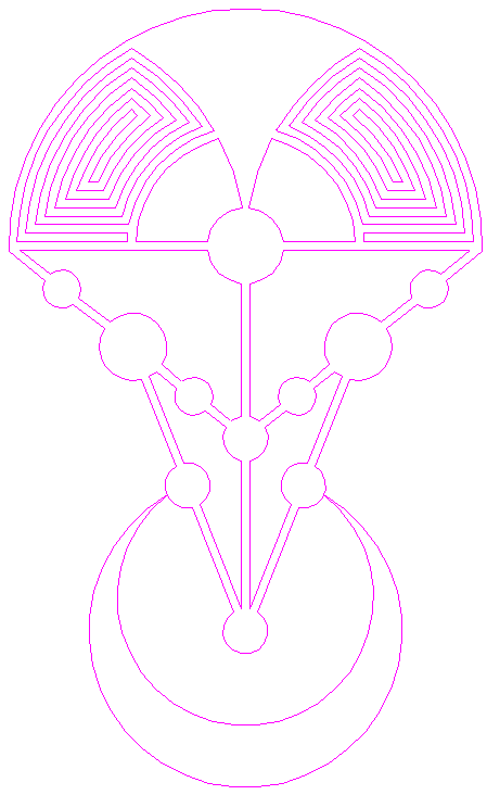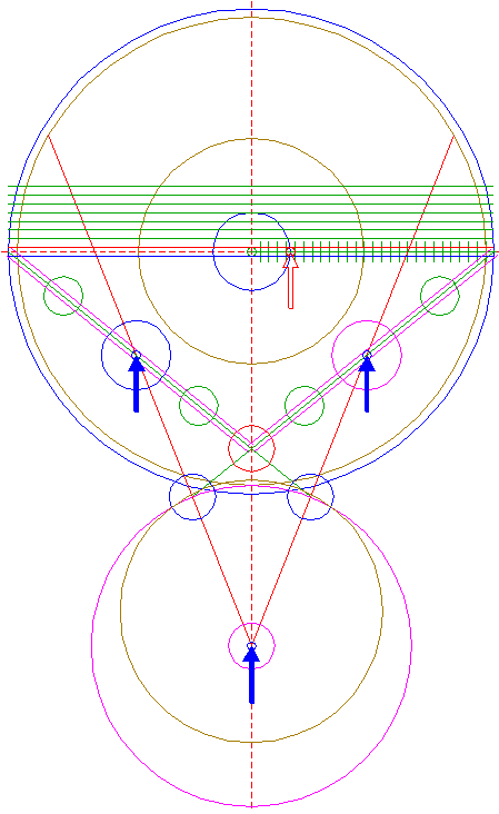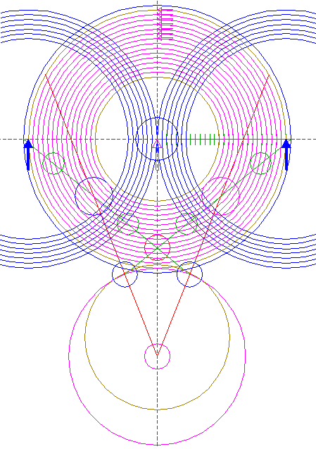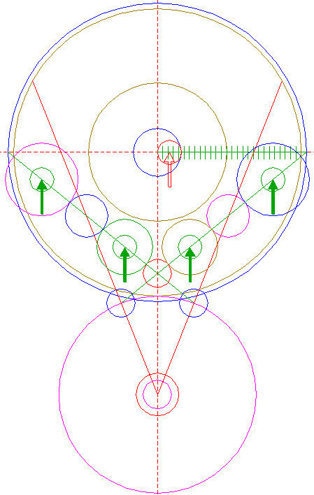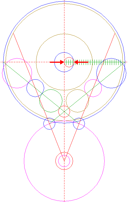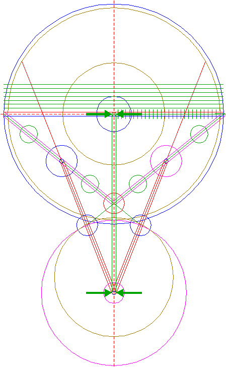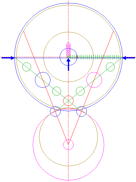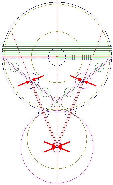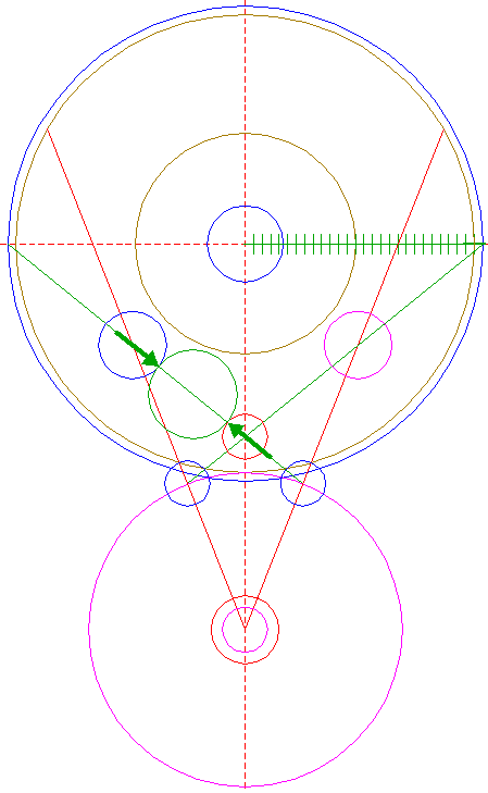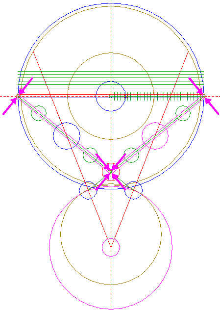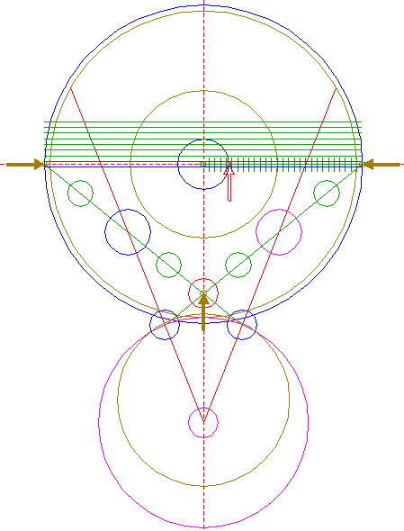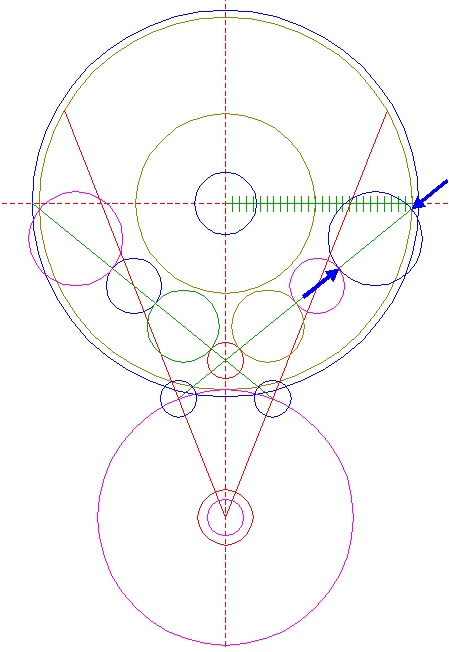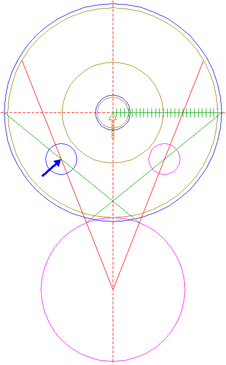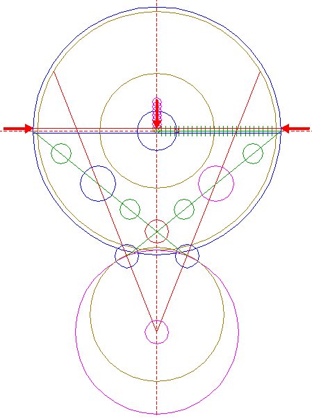 | Copy circle 32 three times, to the lefthand and righthand intersections of circle 1 and the horizontal centerline, and to the center of circle 22.