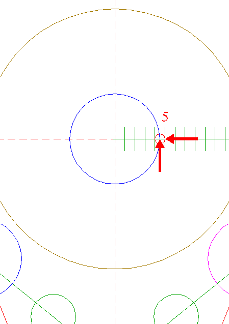 | Construct a circle centered at the righthand intersection of circle 6 and the horizontal centerline, passing through node 3 nr. 5.