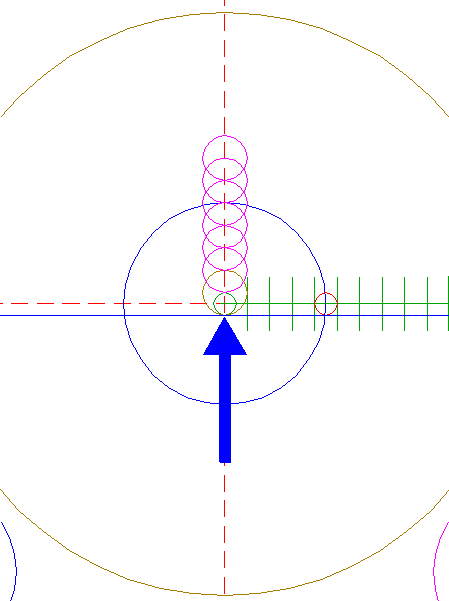 | Copy circle 34 six times, to its upper intersection with the vertical centerline, and consecutively to the corresponding intersections of the copied circles, as shown.