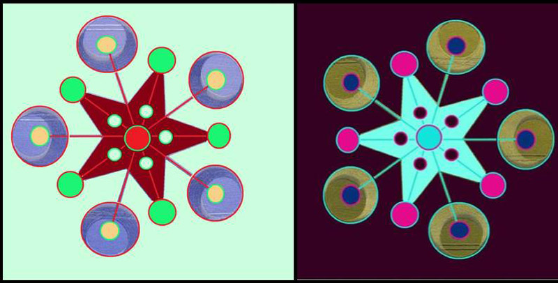 surrounded by 5 circles and in the outer ring there are 10 circles,