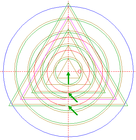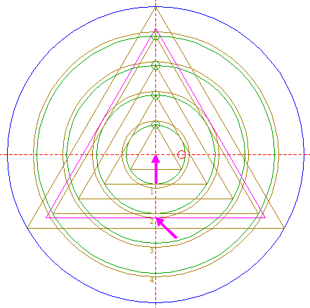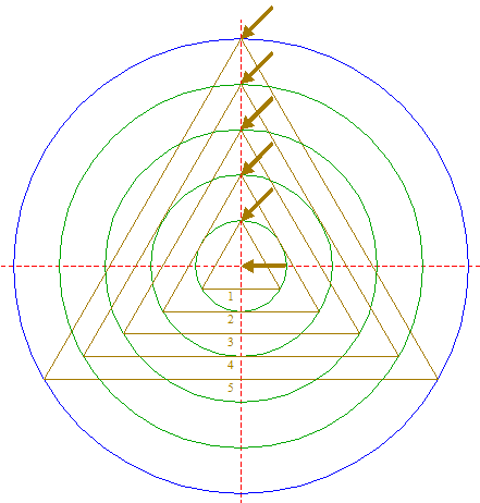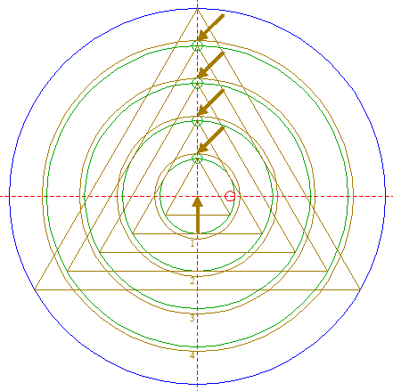 4. | ![]() | Construct the five inscribed equilateral triangles of circles 1 and 3, all pointing up. Number the triangles 1 - 5 from inside outwards. |