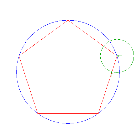3. | ![]() | Construct a circle centered at the upper righthand angular point of pentagon 2, passing through the righthand intersection of pentagon 2 and the horizontal centerline. |