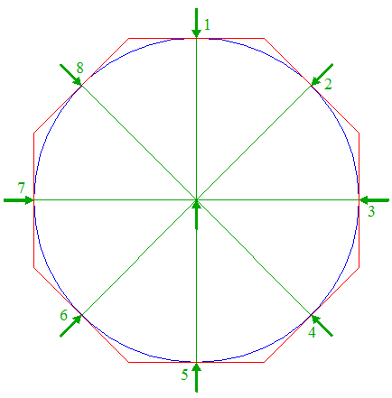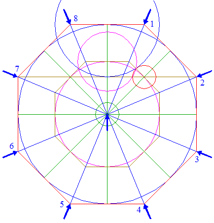 3. | ![]() | Draw eight rays of circle 1, from the center to the intersections (tangent points) with octagon 2. Number the rays 1 - 8 clockwise, starting at the top. |
