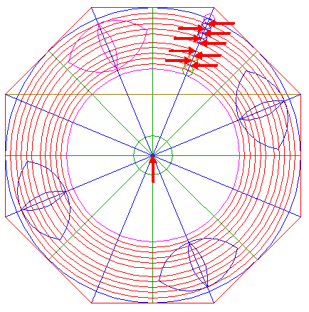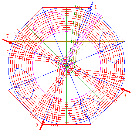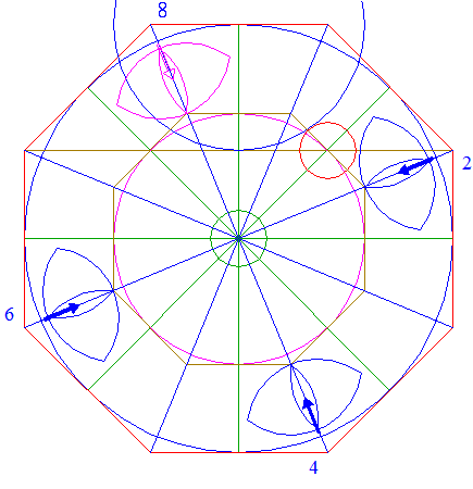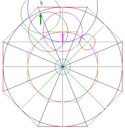 11. | ![]() | Draw the eight rays of octagon 2, from the center to the angular points. Number these rays as well as the angular points 1 - 8 clockwise, starting next to the top to the right. |