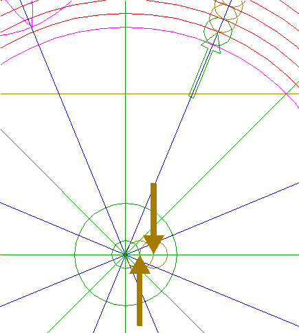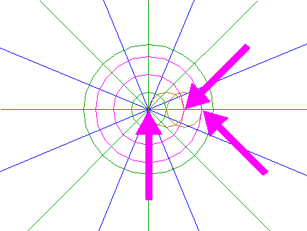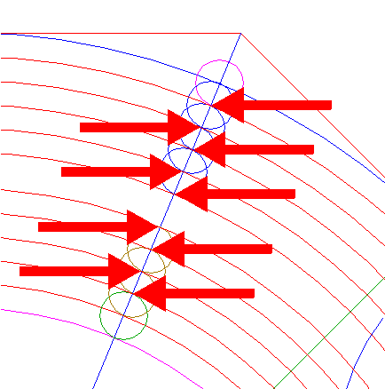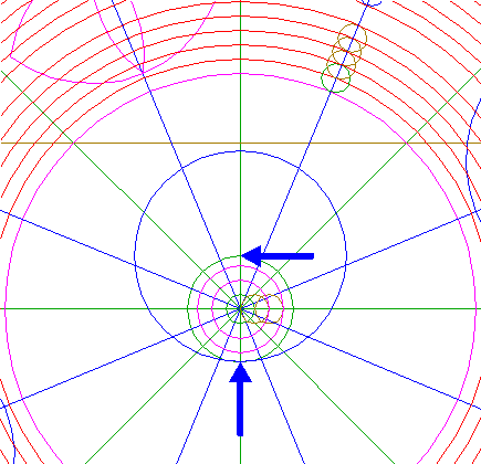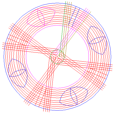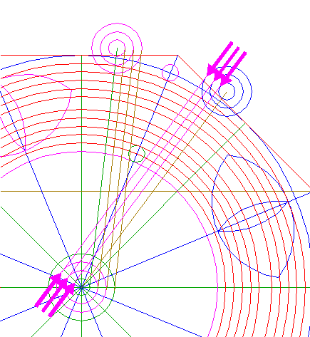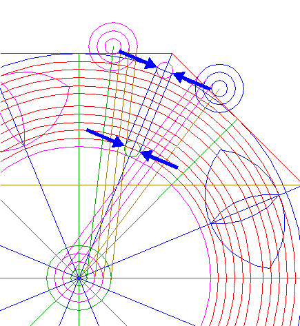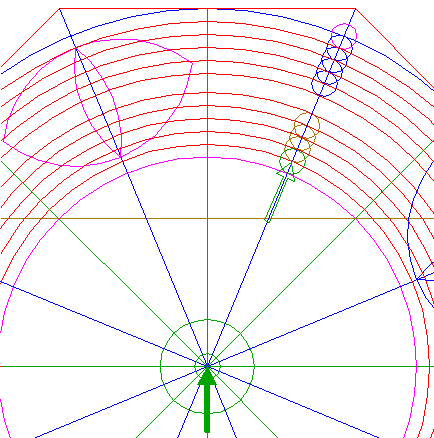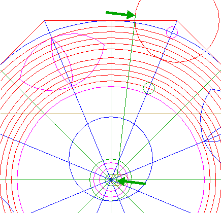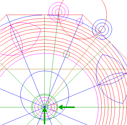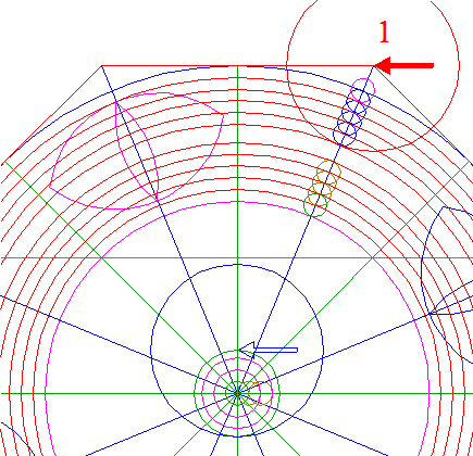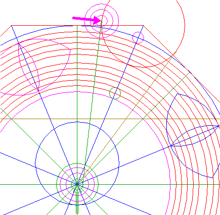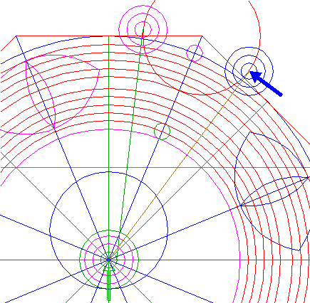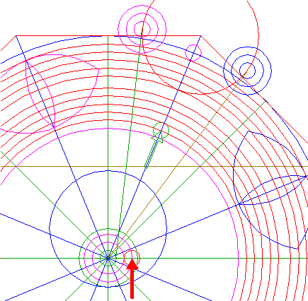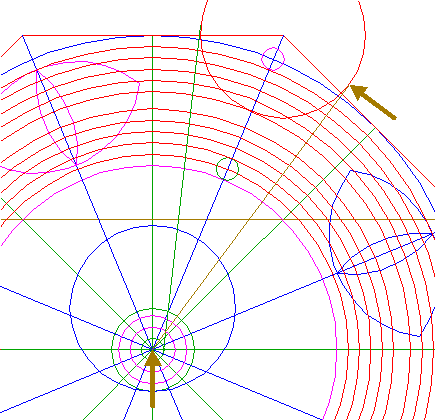 22. | ![]() | Construct nine circles concentric to circle 1, passing through the upper intersections of circles 18 and 19, and the lower intersections of circles 20 and 21, all with ray 11 nr. 1. See detail. |