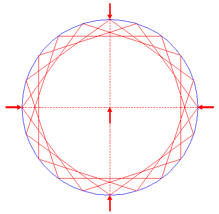 | Construct four inscribed pentagons (regular 5-sided polygons) of circle 1, one pointing up, one pointing down, one pointing to the left, and one pointing to the right.