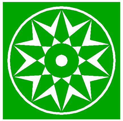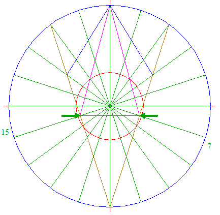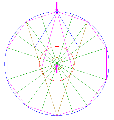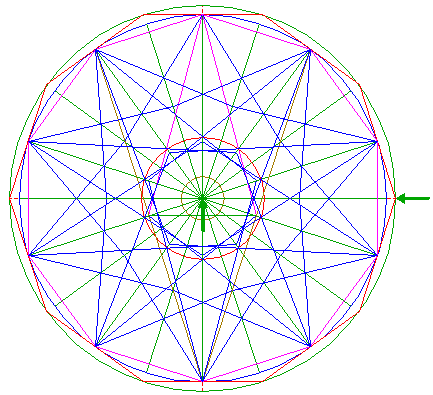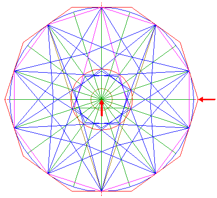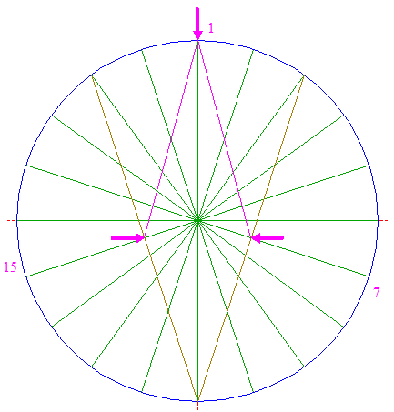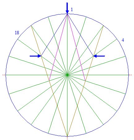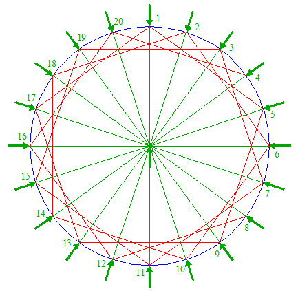 | Draw the twenty rays of pentagons 2, from the center of circle 1 to the angular points. Number these rays 1 - 20 clockwise, starting at the top. These numbers will denote the angular points as well.
