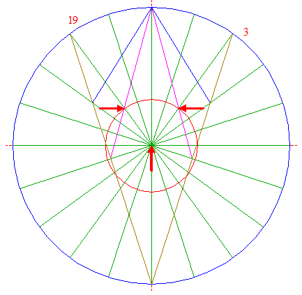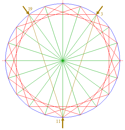 | Draw two lines, from angular point nr. 11, to angular points nrs. 3 and 19, respectively.