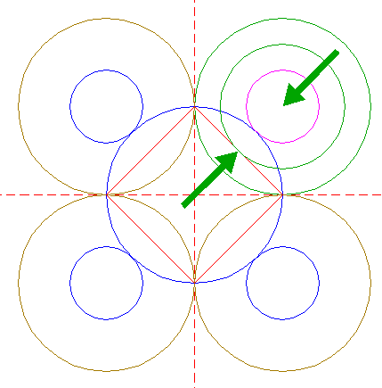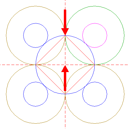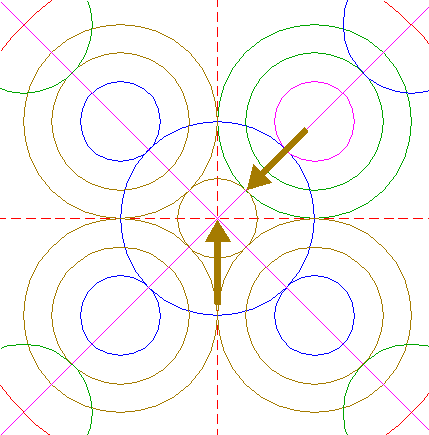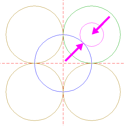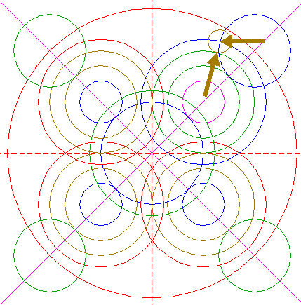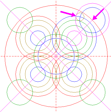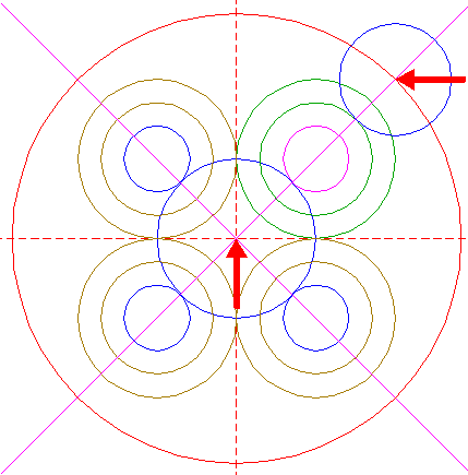 36. | ![]() | Construct two circles concentric to circle 1, tangent to circles 35 at the upper sides. |