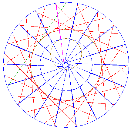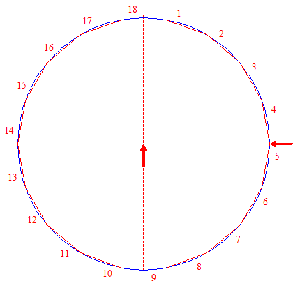 2. | ![]() | Construct the inscribed regular 18-sided polygon of circle 1, pointing to the right. Number the angular points clockwise 1 - 18, starting at the top. |