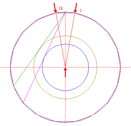 7. | ![]() | Draw two rays of polygon 2, from the center of circle 1 to angular points nrs. 1 and 18. |