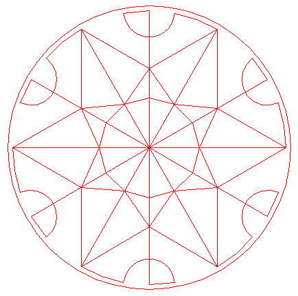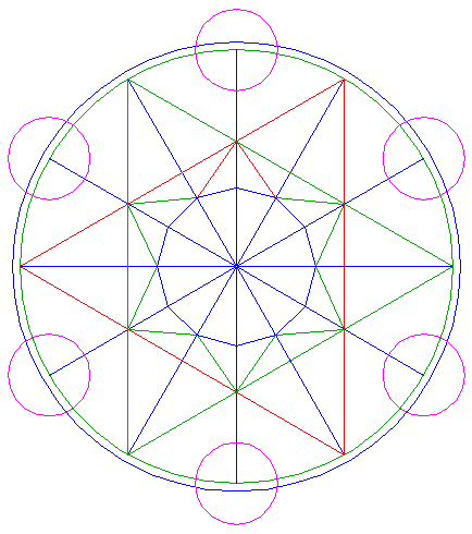 6. | ![]() | Draw twelve rays, from the center of circle 1 to the angular points of hexagons 4 and 5. |