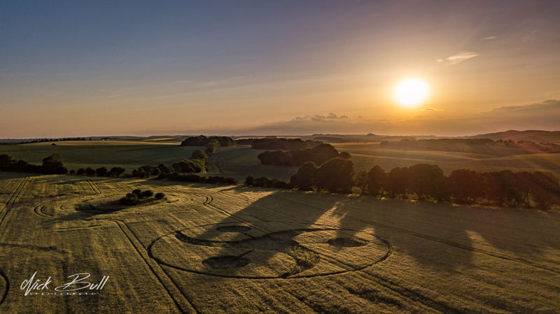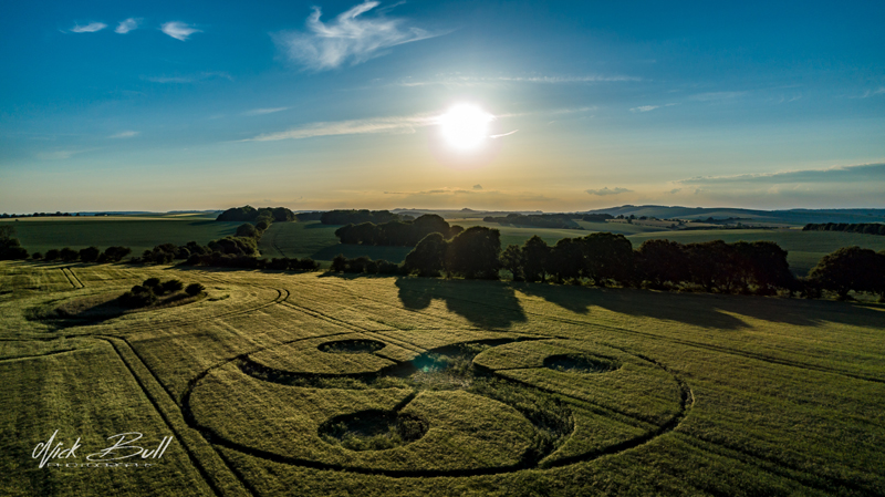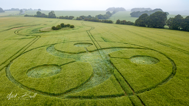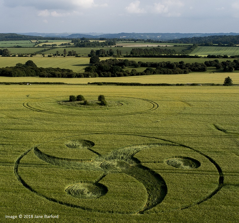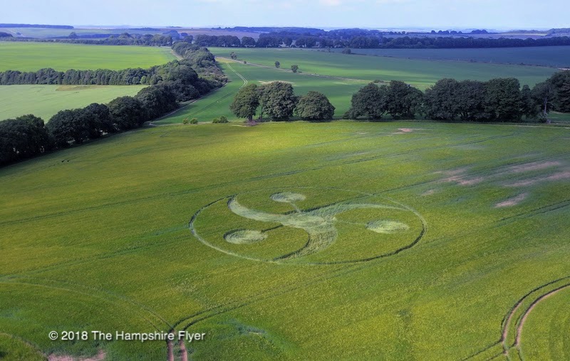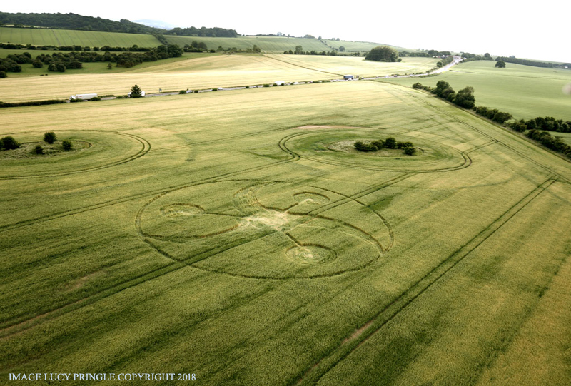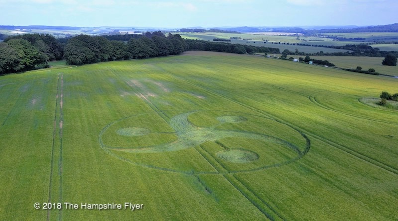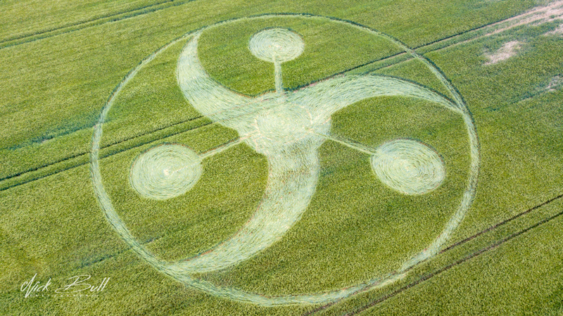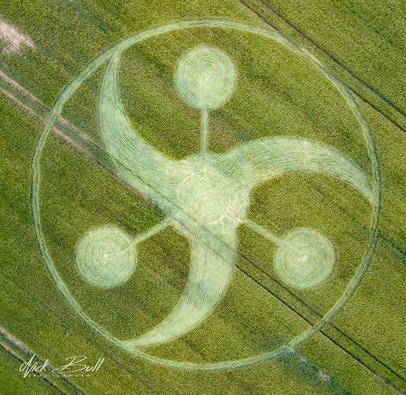 Keysley Down, Nr Chicklade, Wiltshire. 10th June 2018. c. 100 feet (30.5m) diameter. Barley. A circle containing three equally spaced curved blades with three equally spaced lollipops in between.