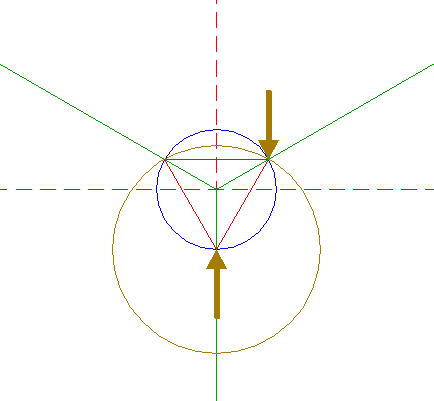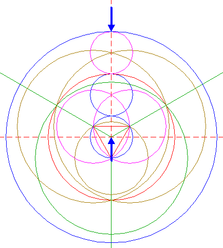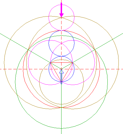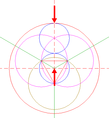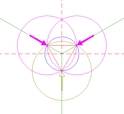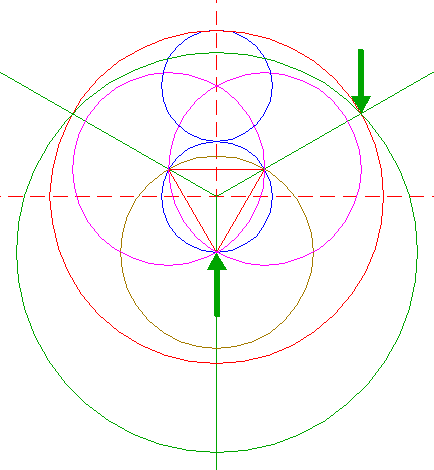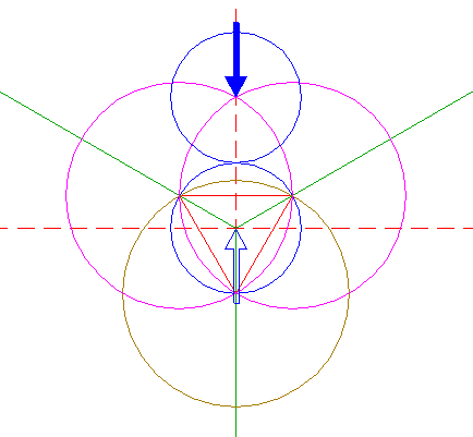 | Construct the inscribed equilateral triangle of circle 1, pointing down. |