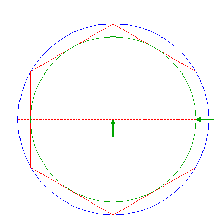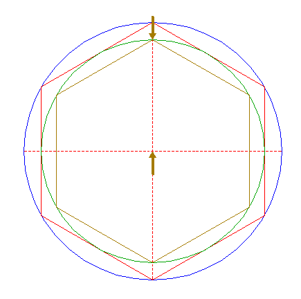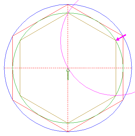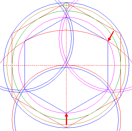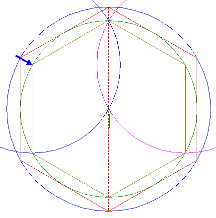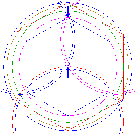 | Construct a (very small) circle centered at the upper intersection of circle 8 and the vertical centerline, tangent to the upper righthand side of hexagon 2.