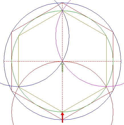 | Construct the inscribed hexagon (regular 6-sided polygon) of circle 1, pointing up.