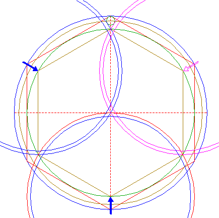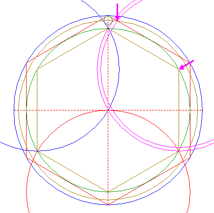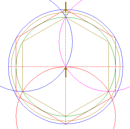 | Construct the inscribed hexagon of circle 3, pointing up.