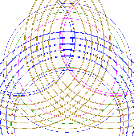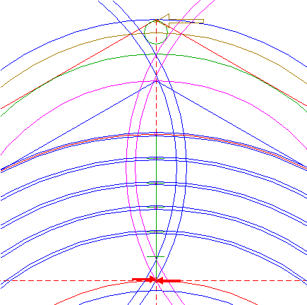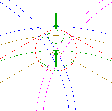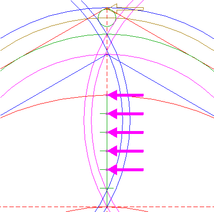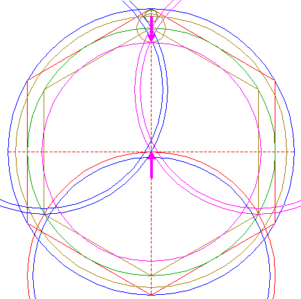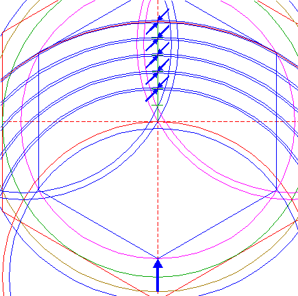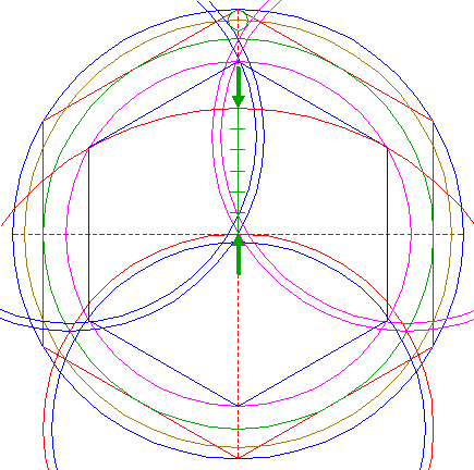 | Draw the connecting line between the center of circle 1 and the upper intersection of circle 17 and the vertical centerline. Divide this line into six equal parts.
