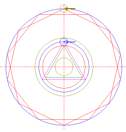 | Construct two inscribed heptagons (regular 7-sided polygons) of circle 1, one pointing up, one pointing down.