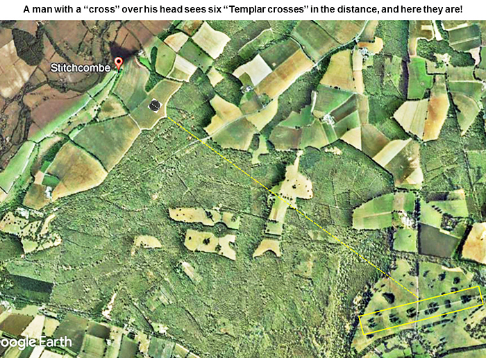 Some interesting new observations concerning a “co-created” crop picture from August 3, 2005 which showed six “Templar crosses”: striking and informative landscape images nearby A fairly-obscure event from August 3, 2005 just came to the attention of many people worldwide, when Roeland Beljon informed an audience in Glastonbury that he and five other people, sitting in a restaurant in Marlborough, had apparently “co-created” a new crop picture which appeared several days later in a field not far away. All six of the people there had collectively focussed their minds on the shape of a “Templar cross”, and then six “Templar crosses” were drawn in crops near Stitchcombe at latitude 51.416o N, longitude 1.675o W (see Crop-circles-Wiltshire-made-mind-power-Roeland-Beljon-Glastonbury-Symposium). There is no question as to whether this strange event actually took place as Roeland Beljon has described. Two of my other friends from the Netherlands told me about it many years ago. Was it just a “strange coincidence” which might happen once in a thousand times, if people were to “ask” for new crop circles? Or were those six people really being “watched” by unseen beings, who observed their thoughts and/or actions, then made a new crop picture accordingly as a response? How can we learn more? No one has yet studied carefully where that 2005 crop picture was drawn, but only the images which it showed in fallen crops. When we study where it was drawn, using Google Earth, we can see right away that it was drawn inside the “mind” of a “man” with a four-armed “cross” over his head, who seems to be “looking” off into the distance at “six Templar crosses”: