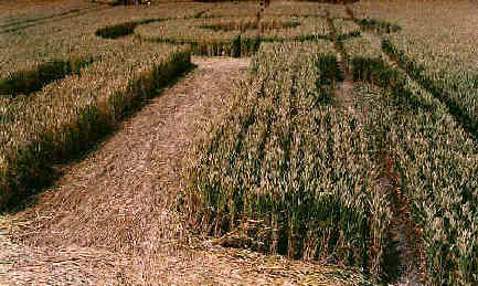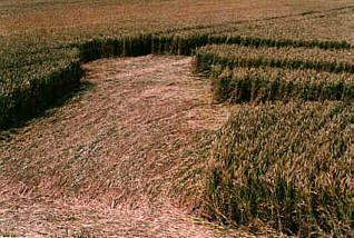 The key features further down on the second Dumb bell displayed a forking feature into the standing crop walls, with gap seeking trails leading off into the unaffected plants. This was mirrored on the fork feature on the other side of the formation. The 1990 East Field formation I hope has been placed within the Crop Circle Connected with great fondness, and will always be remembered by the most active 'Croppies' who where fortunate enough to experience the 1990 season, and the events surrounding this extraordinary time in our lives.