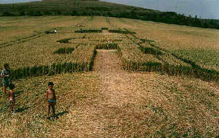 The Crop Circle Connector has included this additional report and further photographic record of this formation, as it will always remain a fond and magical memory to us, back in those heady days of 1990. In some way we are celebrating this formation, as it is quite hard to capture this particular event in July 1990. Many thousands of people came to visit the formation from all over the country and world, and from all walks of life. Crop Circles are generally places where you can probably only connect with complete strangers with regard to their thoughts and experiences on life, and the meaning of it. This was the first formation to actually connect with other people, and that is one of the magical sides to this phenomenon, because it brings people together, who outside in the modern world wouldn't give each other the time of day. Its quite extraordinary, and Alton Barnes was almost the pioneer formation for this unorthodox gathering of people. Certainly the roadside to East Field was an indication of the power of this formation, it resembled at times a Car Park, as people scrambled for a place to view the formation, and even used their car roof's to get a better elevation for their photographic albums. On to the actual floor construction of East Field, it has taken a time to each point, but I wanted to describe the events and experiences surrounding this formation. The overall length of the formation was the largest in the world at that time, some 430 feet in length. It comprised of six main circles in a line, with two independent dumb bell designs, with one single outer ring circle creating the head of the formation. The crop itself was as flat as a pancake, I can't stress how flat it was (See Photographs) every part of the formation had the same applied pressure on the plants, even the main key feature on the head circle was the same, with the crop flowing perfectly into each fork segment. The main circles on the formation where flowing in a Clockwise rotation, and the boxes on either side of the connecting avenue carried on the same design from the Cheesefoot Head formation from earlier in the season.