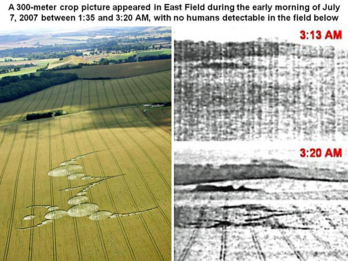 Hard factual evidence for three paranormal crop circles: could Michio Kaku, Richard Taylor and Physics World all be advocating an incorrect theory? “We must work on evidence and not conjecture”---Rod Bearcloud Summary. A new article was published in Physics World last summer, saying how microwave ovens and GPS (rather than rope and boards) are being used to make crop circles (field pictures) all over the world (see www.telegraph.co.uk). This came as a surprise to many human crop artists in England, because they still use rope and boards, even though the fallen plants in certain crop circles sometimes show a signature of microwave heating. Whenever microwave generators have been tested by human crop artists, those energies essentially kill the plants, or set them on fire, just as for excess heating of food or drink in your microwave oven at home. So now there are two competing theories of “rope and boards” versus “microwave energies”: which could be correct? In fact, none of those distinguished professors (or news sources) actually listed the detailed facts of crop circle formation in southern England, or other countries, while making their reports. They simply speculated, without much detailed knowledge or evidence, that local humans were making fifty or more crop pictures each summer for the past 20 years, through the use of microwave ovens and GPS. Yet sometimes crop pictures have appeared very silently and quickly, with no humans present in the field or nearby. Here we will summarize the hard facts of crop circle formation for three field pictures from Stonehenge 1996, East Field 2007 or Cherhill Down 2011, which were multiple eyewitness or filmed accounts. The evidence shows that they all probably have a paranormal origin, by any reasonable standards of testimony or documentation as would be accepted in court. We will also list a whole series of single eyewitness accounts or other unusual films, which are more anecdotal in nature, but serve to confirm that something of a paranormal nature is going on. Why has mainstream science so far rejected the evidence for paranormal crop circles, or at least refused to examine it? One can see a close analogy here as to how mainstream science regarded “meteorites” in the 18th century. A large body of evidence concerning meteorites had been accumulating for hundreds of years. Yet it was ignored or even scorned by mainstream science, because “everyone knew” that rocks could not fall from the sky! Even if many reliable witnesses gave first-hand testimonies about meteorites, or if the chemical compositions of such fallen rocks were found to be highly unusual, such observational and/or experimental evidence did not fit into an 18th-century view of how our world worked. It was not until 1803, when 3000 stones fell at once in front of dozens of witnesses in France, that the French Academy of Sciences finally capitulated, and began to study an extensive body of data which had been available to them for many years (see www.meteoris.de ). A new theory of crop-circle making was proposed last summer “In judging between two different scientific theories, what else is there but the details?”---Sir Aaron Klug Last summer in the August 2011 issue of Physics World, volume 24, number 8, pages 26-31, Professor Richard Taylor proposed a new theory of crop-circle making entitled “More than mere patterns? The science behind crop circles”. Several observations from the peer-reviewed literature had suggested that a previous theory was either inadequate or incorrect. To be specific, mainstream scientists had previously attributed all English (or other) crop pictures to human fakers with rope and boards, who would supposedly sneak into various fields late at night, to make large and intricate patterns without ever (or almost never) being seen or caught. Now however by 2011, it had become clear that the previous theory was untenable. Many new crop circles were appearing with a (i) high complexity and/or (ii) high speed that the slow, laborious, rope-and-boards method could not account for. Also, biophysical investigations of fallen plants had sometimes shown evidence for local microwave heating. In some cases this was due to heating of internal liquids, which would cause outer parts of the plant to expand or explode. In other cases it was due to burning of the plant tissue, which would cause outer parts of the plant to appear black or charred (see for example www.bltresearch.com or www.swirlednews.com or Deepening-Complexity-Crop-Circles-Scientific). Professor Taylor first cited evidence from the literature, to suggest that microwave energies (rather than rope and boards) were being used to create certain crop pictures. Then as a corollary to that hypothesis, he speculated that human fakers might be making crop pictures much faster and with a greater complexity than ever before, by using portable microwave generators and GPS (see http://physicsworld.com or www.popularmechanics.com):