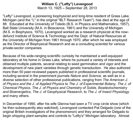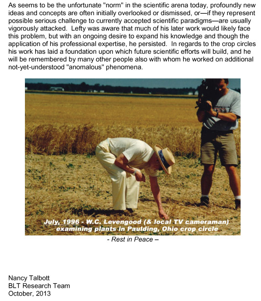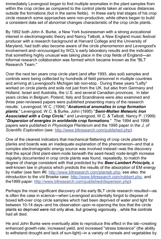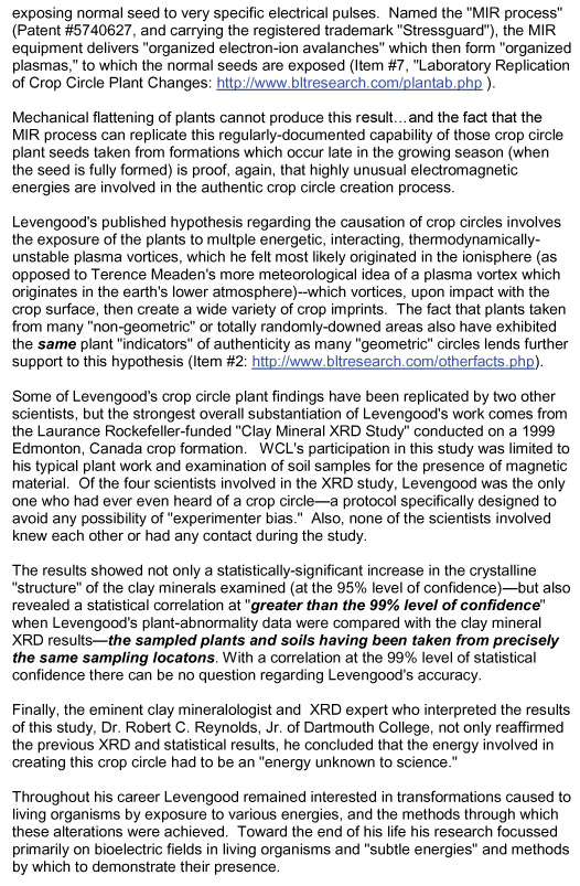 Appendix:- Some of Levengood's crop circle plant findings have been replicated by two other scientists, but the strongest overall substantiation of Levengood's work comes from the Laurance Rockefeller-funded "Clay Mineral XRD Study" conducted on a 1999 Edmonton, Canada crop formation (http://www.bltresearch.com/xrd.php). WCL's participation in this study was limited to his typical plant work and examination of soil samples for the presence of magnetic material. Of the four scientists involved in the XRD study, Levengood was the only one who had ever even heard of a crop circle—a protocol specifically designed to avoid any possibility of "experimenter bias." Also, none of the scientists involved knew each other or had any contact during the study. |