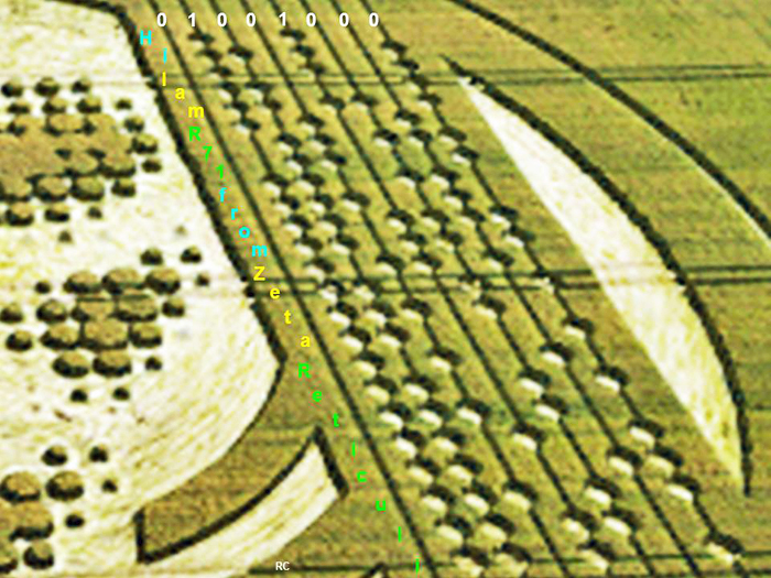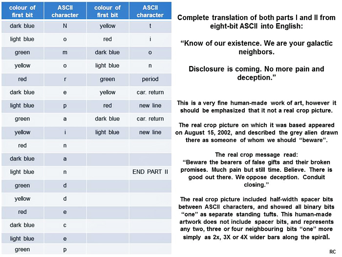 The first binary code from human computer art, based on a crop picture near Crabwood in 2002, explained and decoded We are grateful that a skilled human computer artist (see http://r71.deviantart.com/gallery) has provided a copy of his new work for careful study, and for translation from eight-bit ASCII into English. This new human art is stunning in its beauty and complexity. Yet it still does not reach the incredibly high standard of the original, which appeared in crops near Crabwood Farm House on August 15, 2002. The new human-made artwork shows a CD-like spiral binary code which reads: “Know of our existence. We are your galactic neighbors. Disclosure is coming. No more pain and deception.” There is also a second binary code in the “face” (similar to Wickham Green of July 2010) which will be discussed later. If humans can make something like this on a computer, why couldn’t they do the same in a field? How do we know that the original Crabwood 2002 crop circle was not a human-made fake? I have thought it necessary to address this question, despite my high respect for the human computer artist, because 99.99% of humans living on Earth today do not understand that some (or many) crop circles are not made by humans local to Earth, but rather by advanced intelligences from another space and/or time. Please see http://www.cropcircleconnector.com/anasazi/time2007n.html or http://www.cropcircleconnector.com/anasazi/time2007o.html for further details of the original Crabwood 2002 field image. What are the major differences between this computer-drawn version of Crabwood 2002 and the field original? First, the original showed a clever landscape symbolism, and was drawn near the schematic image of a “cow” in the landscape on a large scale, to suggest that grey aliens are responsible for cattle mutilations worldwide. Secondly, the “grey alien face” was drawn in crops using a 60-line grid, with lines of variable thickness to confer the “face” image, somewhat like for an early TV screen of the 1940’s or 1950’s (which was when they met some of our governments in secret). Thirdly, the original field image showed “half width spacer bits” in the “CD spiral disc”, which the new computer version does not. Fourthly, the original field image showed all binary bits “one” as separate standing stalks, whereas this computer version shows any two nearby binary bits “one” as a single bar of double width, or three nearby binary bits “one” as a single bar of triple width, and so on. Fifthly, the original field image showed a 1360-bit binary code which was overlaid with another 25-bit binary code by the method of “digital steganography”. Thus some words from its binary message showed “false capitalization” (in the style of Francis Bacon), in order to provide a second “hidden” set of binary numbers, which only those skilled at the technique would be able to read! This second hidden code seems to say “50 years in a Mayan 52-year calendar”, which is appropriate since those grey aliens flew over the White House in July of 1952 (or 50 years before the crop picture appeared in August 2002). We would therefore like to commend the human computer artist for his fine and detailed new image based on Crabwood 2002, while at the same time emphasizing that no human crop artist has ever come close (on a computer or in the field) to replicating all important details of the original message. These facts seem to argue convincingly that it was not made by humans local to Earth. “When deciding upon the merits of one scientific hypothesis versus another, what else is there but the details?”---Sir Aaron Klug (my advisor in Cambridge 1982-86) A second binary code was drawn alongside the “face of a grey alien” in this computer art model The second binary code from this computer art model reads “Hi I am R71 from Zeta Reticuli”: