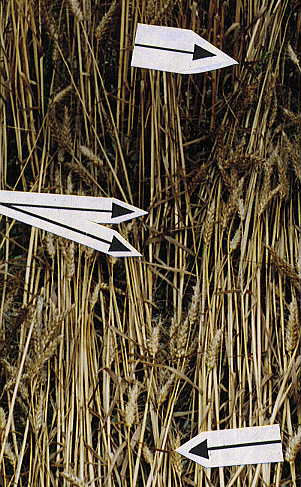 The photo on the left shows one of the two ways in which the CircleMakers have consistently terminated a Path. The three distinct groups of stalks (a result of the three separate tracks) are interwoven with the standing crop just the other side of the SoundBarrier. Examples of Bundling are indicated by the arrows. You can actually see the top stalks laying left-to-right across the ones beneath them; these Bundles are 'tied' by their leaves (which appear as dark brown horizontal lines).